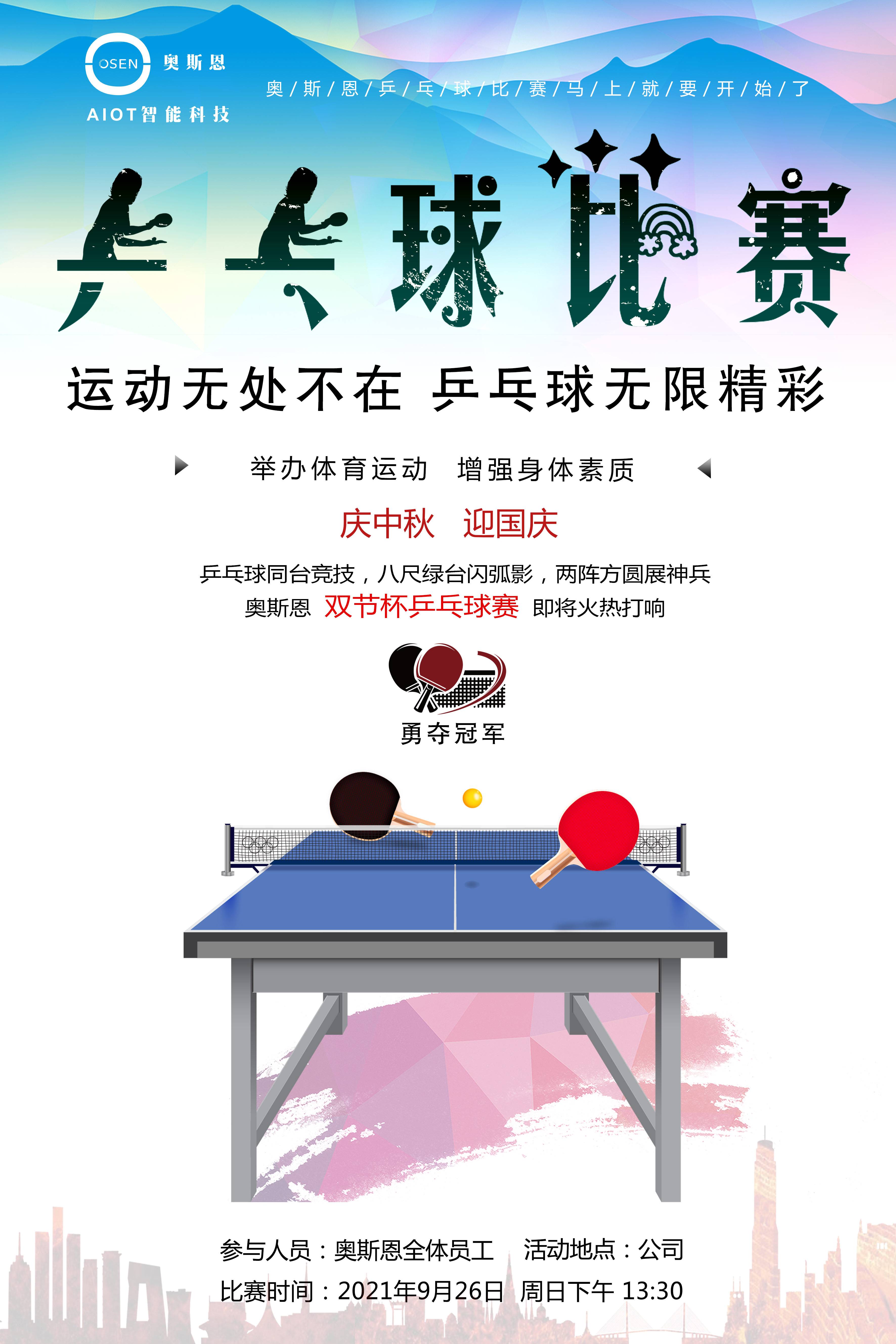 為了增強(qiáng)企業(yè)的團(tuán)隊(duì)文化建設(shè),給大家在日常忙碌的工作中增加幾分樂趣,提供溝通交流和娛樂的空間,公司開拓出了活動(dòng)室,增添了兩張乒乓球桌,同時(shí)給大家在日常工作之余提供鍛煉和放松的休閑場(chǎng)所。增添乒乓球桌之后發(fā)現(xiàn)大家的運(yùn)動(dòng)細(xì)胞還是挺多,而且乒乓球打得還真的有兩下子,所以公司決定趁著這股“乒乓熱潮”,開展我們每年的運(yùn)動(dòng)會(huì)系列活動(dòng)。定于9月26日下午在公司內(nèi)部活動(dòng)室舉辦主題為“慶中秋,迎國(guó)慶”的乒乓球比賽,此次比賽采取雙打規(guī)則,且多以男女混雙搭檔為主,體現(xiàn)出“男女搭配,干活不累”的默契配合,也體現(xiàn)了奧斯恩團(tuán)隊(duì)活動(dòng)的趣味性和全民參與感。